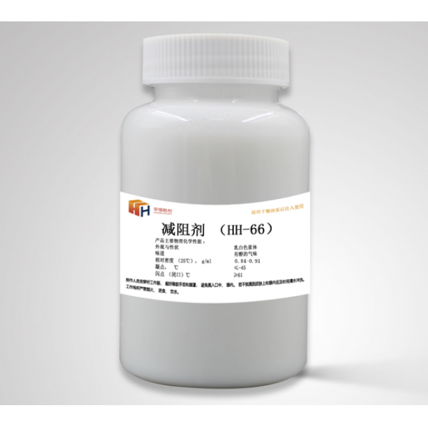 江陰華恒助劑有限公司研發(fā)的成品油減阻劑(HH-66)是梳狀聚a-烯烴減阻劑,該產(chǎn)品為聚合物粉末分散在有機(jī)醇中,形成漿狀產(chǎn)品,便于產(chǎn)品的注入。當(dāng)該產(chǎn)品注入到成品油中,聚合物粉末能快速溶解在成品油中,聚合物舒展成長碳鏈?zhǔn)釥罹酆衔铮行У馗淖兞肆黧w的形狀,降低了湍流的形成,減少了流體運(yùn)動(dòng)過程中能量的消耗,減少了流體在管道運(yùn)動(dòng)的阻力。當(dāng)輸油管線的輸量恒定時(shí),可以降低管線的壓力。當(dāng)輸油管線壓力恒定時(shí),可以提高管線的輸油量。在加量為5-60ppm的范圍內(nèi)可以有效地降低管線的阻力,提高管線的輸送能力,提高管線的輸油經(jīng)濟(jì)效益。該產(chǎn)品凝點(diǎn)低,適應(yīng)于在低溫環(huán)境下注入使用,該產(chǎn)品揮發(fā)性小,環(huán)保安全。